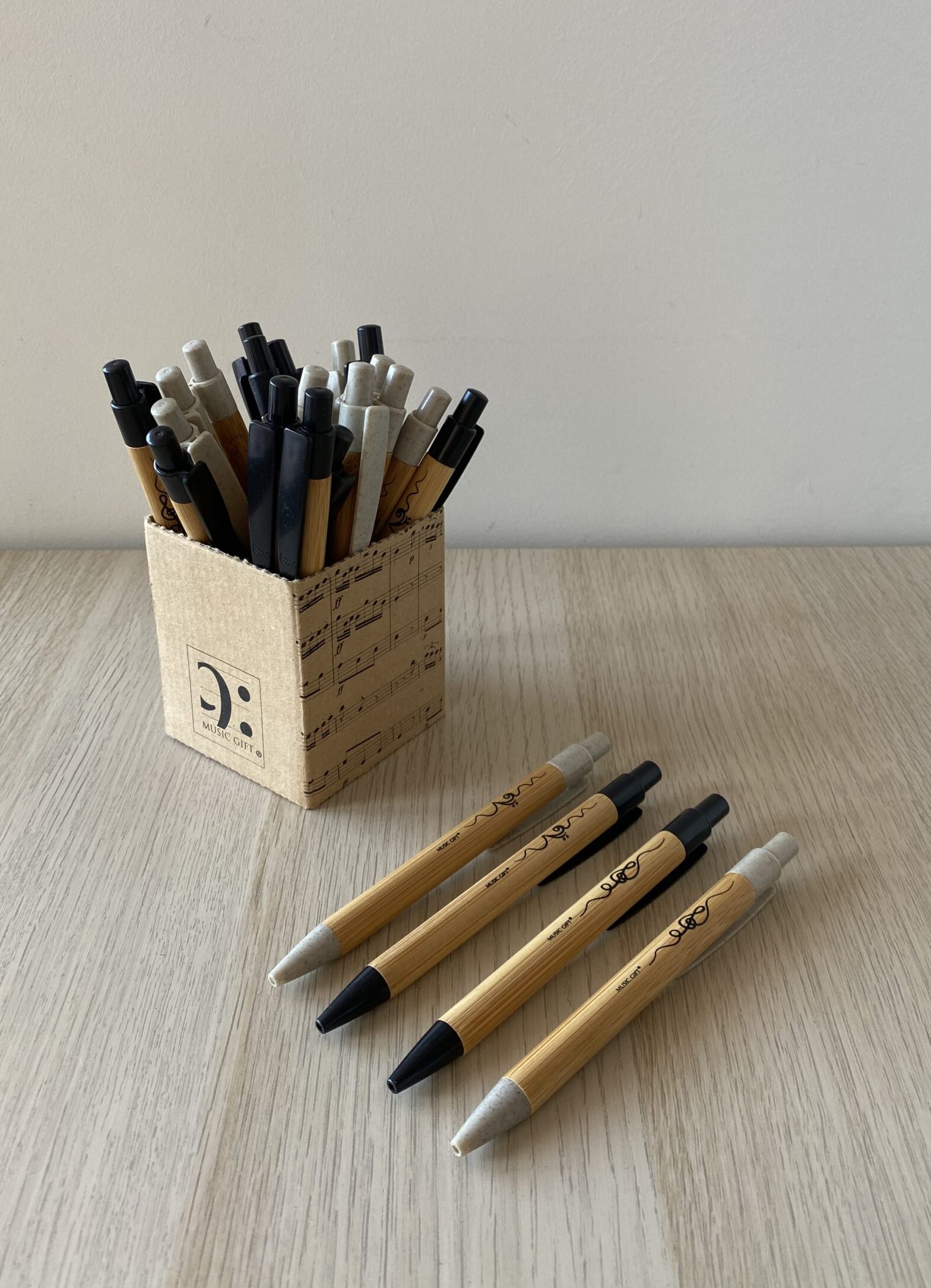 Because MUSIC GIFT is always trying to innovate we have these new pens with an unique musical design made out of bambu and wheat straw. 100% sustainable, made out off recycled materials.